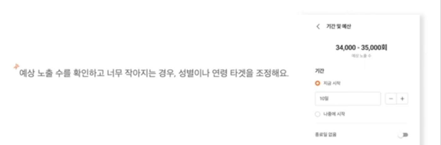 타겟을 설정하고 나면 광고 기간이나 예산을 설정하는 페이지로 넘어가게 된다고 합니다. 예산 설정하는 단계에서 앞 단계에서 설정한 타겟 정보 기반으로 광고가 얼마나 노출될지를 의미하는 예상노출수가 화면 위에 보여지 게 된다고 합니다. 특정 성별이나 연령 타겟을 설정하니 예상 노출수가 너무 적다면 이럴 때는 조정해 보는 것이 좋다고 합니다. 내가 고른 동네 원하는 성별 조건 , 연령 조건까지 붙이면 광고를 보여줄 대상자가 줄어들게 된다고 합니다. 같은 지역의 광고를 하는데 적은 사람에게 보여지 게 되면 당연히 광고를 보고 클릭하는 사람들이 줄어들게 되면 그만큼 광고 효과는 낮아 질 수밖에 없다고 합니다. 고객이 되기 힘든 전혀 상관없는 사람에게 광고를 보여주지 않는 것도 중요하지만 많은 잠재 고객에게 광고를 보여주고 관심을 유도하는 것도 굉장히 중요하다고 합니다.