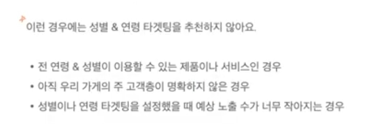 게의 제품이나 서비스를 이용하는 고객이 특정성별이나 연령대의 경우 성별 및 연령 타겟팅을 사용해서 광고 효율을 높을 수 있다고 합니다. 성별 타겟팅의 추천 업종은 여성전용 피트니스, 남자헤어 전문점 같이 특정성별만 이용할 수 있는 제품이나 서비스가 있다면 매우 추천한다고 합니다. 대다수의 고객이 특정성별인 경우가 네일아트, 속눈썹, 산후조리원와 같은 이런 경우도 성별 타겟팅을 활용해 볼 수 있다고 합니다. 연령 타겟팅도 마찬가지인데 특정 연령대가 주로 구매하거나 이용하는 업종이 사용하면 좋다고 합니다. 학부모님들이 주로 보고 구매하게 되는 학원, 가족단위로 필요하게 돼서 특정 연령대에서 주로 결제가 일어나는 포장이사, 청소, 소독 서비스 이런 것들은 전 연령대보다는 10대를 제외하고 실제로 구매할만한 연령대만 골라서 광고를 해 볼 수 있다고 합니다.