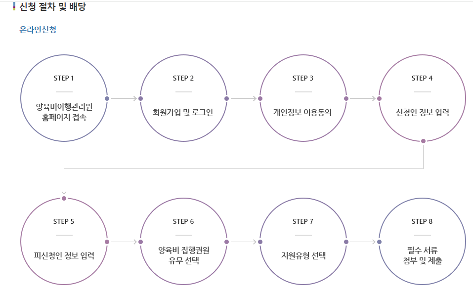 신청 및 접수 안내 신청 절차 및 배당 온라인신청 step 1: 양육비이행관리원 홈페이지 접속 step 2: 회원가입 및 로그인 step 3: 개인정보 이용동의 step 4: 신청인 정보 입력 step 5: 피신청인 정보 입력 s
