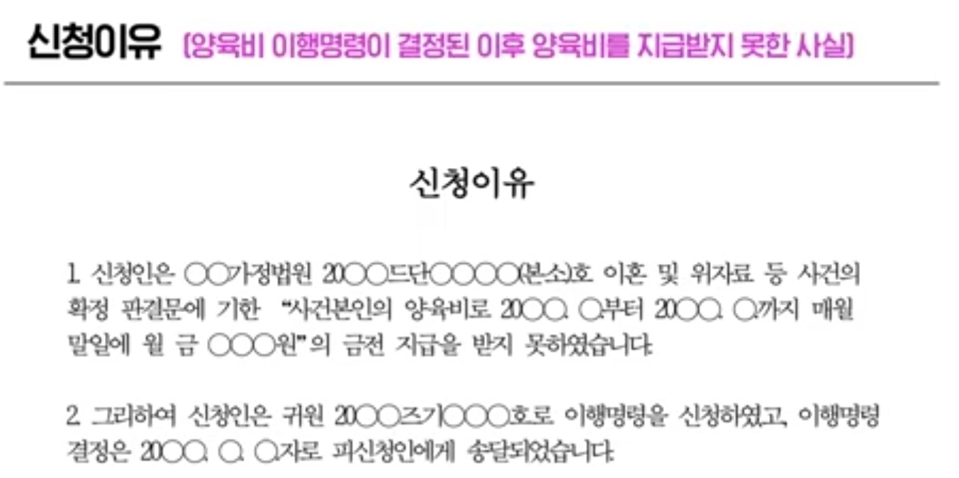 신청이유에는 양육비 이행명령이 결정된 이후에 양육비를 지급받지 못한 사실을 기재하면 된다고 합니다.