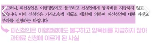 양육비 과태료 신청은 상대방이 양육비 이행명령 결정문을 송달받은 뒤에도 양육비를 지급하지 않는 경우에 1천만 원이하의 과태료를 부과하는 제재방법이라고 보면 된다고 합니다. 그러므로 반드시 이행명령 결정이 선행 되어야 신청이 가능하다고 합니다.