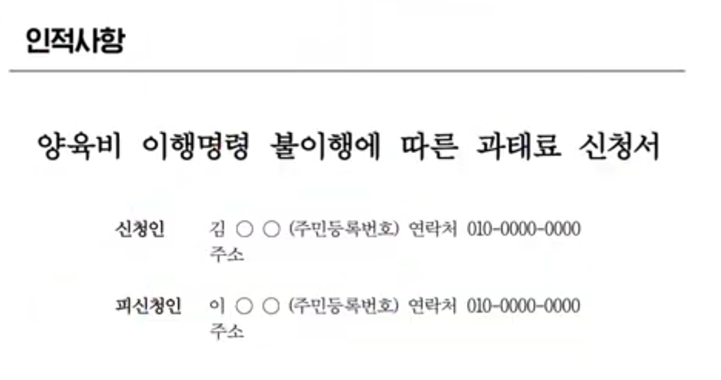 이혼 소송 확정 판결문에 의해 신청인에게 양육비 채권이 발생하여 신청인이 집행권원의 의해 지급받아야 할 양육비를 지급받지 못한 사실과 신청인이 이행명령을 신청하여 이행명령이 결정된 사실을 통해 피신청인은 이행명령에도 불구하고 양육비를 지급하지 않아서 과태료신청에 이르게 된 사실을 기재하면 된다고 합니다.