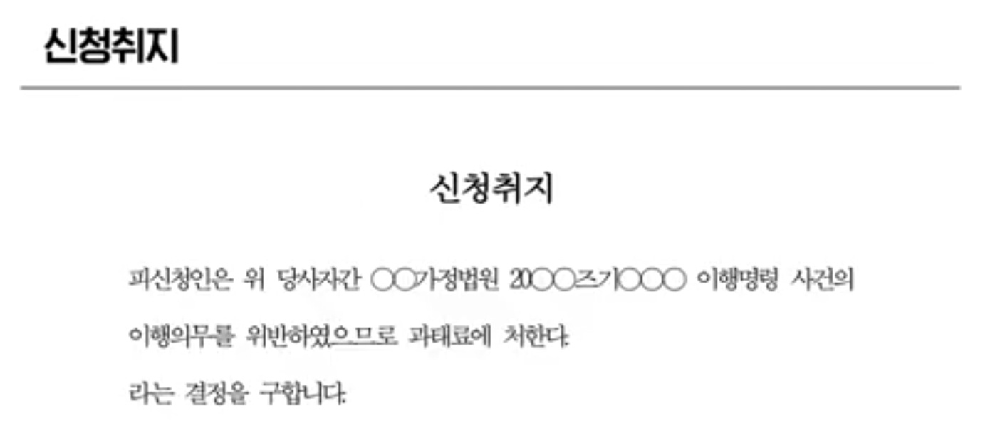 신청취지는 피신청인은 위 당사자 간 이행명령 사건의 이행의무를 위반하였으므로 과태료에 처한다고 기재를 하면 된다고 합니다.
