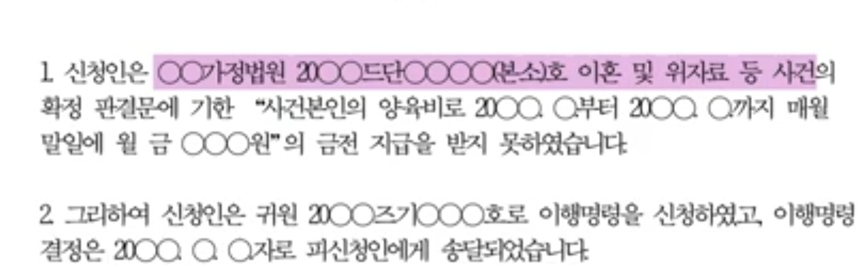 신청이유에서 1항에서기재하는 사건번호는 양육비 지급에 대한 판결문이나 결정문 , 심판문, 조정조서와 같은 집행권원을 말하는 것이라고 합니다. 이혼소송 확정판결문이 해당 집행권원이 될 수 있다고 합니다.
