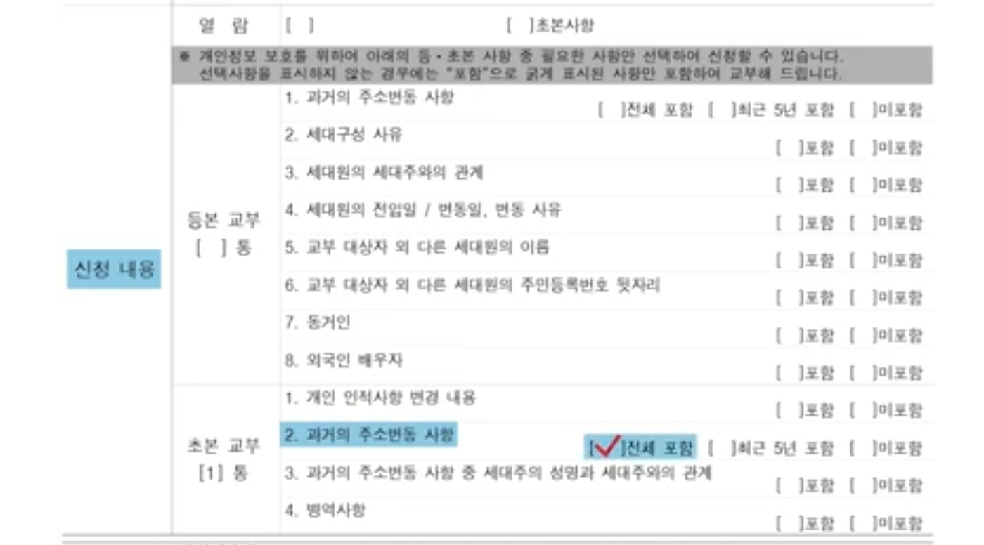 신청내용에서 초본 교부 한통으로 표시하면 된다고 합니다.2항의 과거의 주소변동사항에서 전체포함으로 표시하면 된다고 합니다.